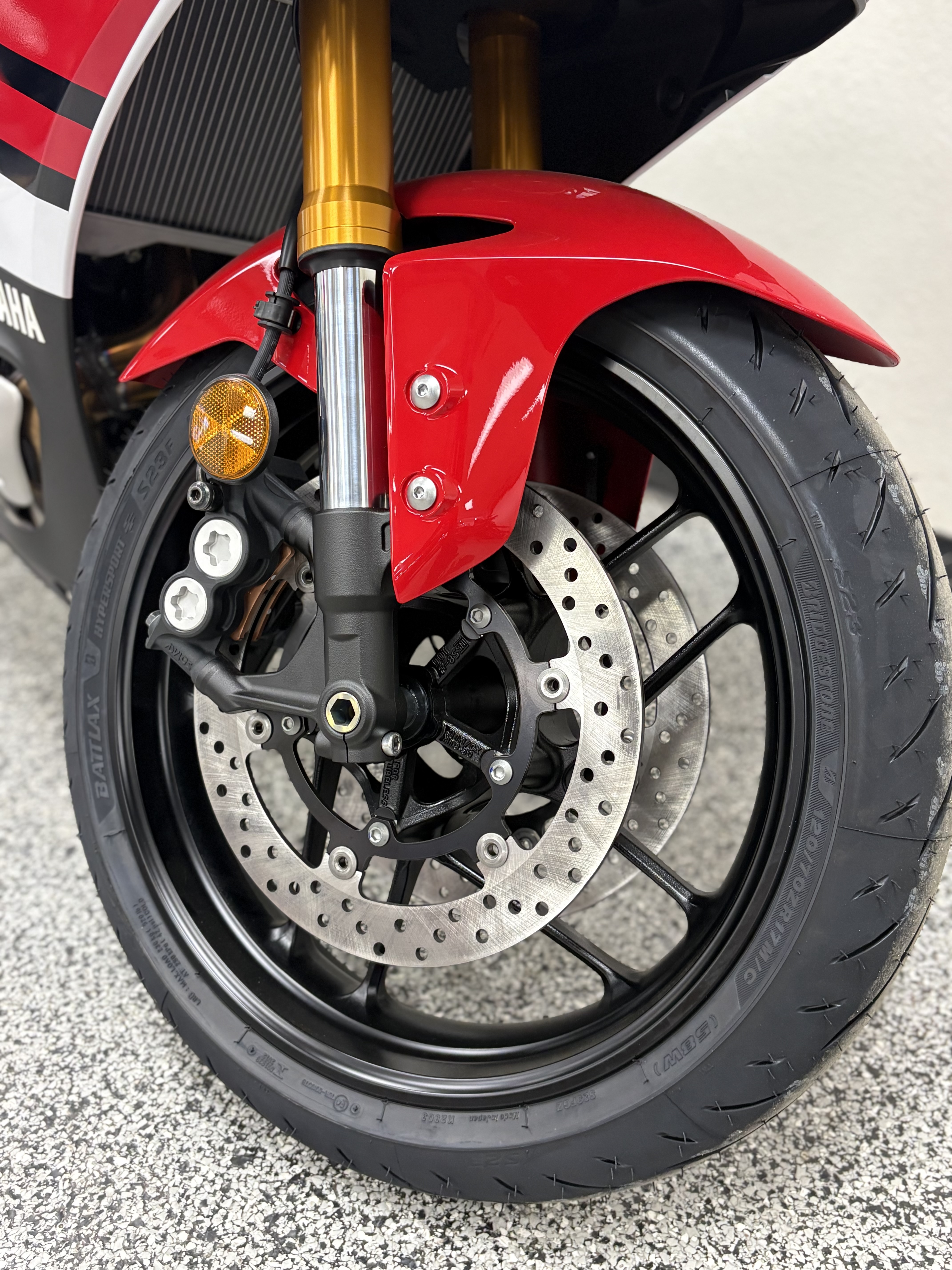- Through Yamaha's exclusive spin-forging process, sporty 10-spoke aluminum wheels enhance looks while significantly reducing unsprung weight. The result is improved suspension action and decreased moment of inertia for a more responsive feel, especially during cornering and braking. The 2026 YZF-R7 also comes equipped with high performance Bridgestone® Battlax Hypersport S23 tires.