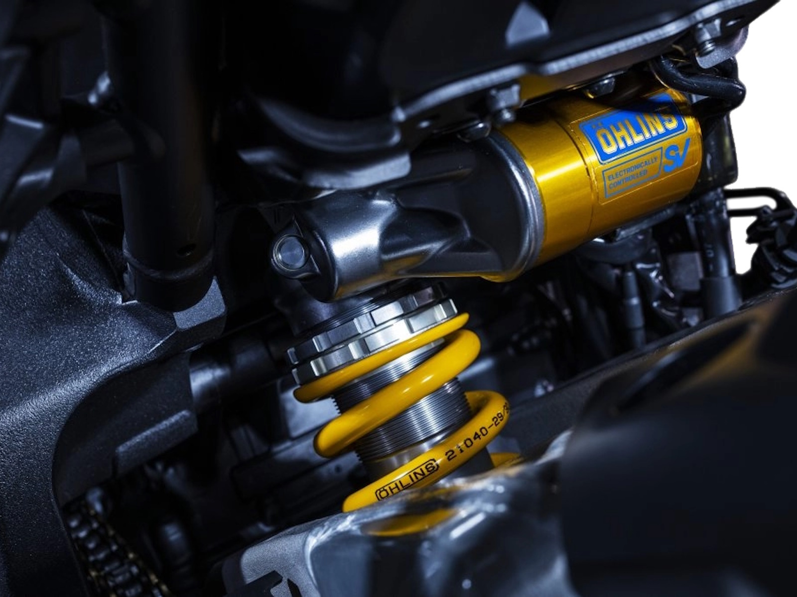 - State-of-the-art Ōhlins® electronically controlled suspension provides riders the choice between three semi-active damping modes (A-1, A-2, A-3), as well as three manual setting modes (M-1, M-2, M-3). When an automatic mode is selected the system adjusts rebound and compression damping continuously to match the current running conditions, ensuring the most appropriate settings are always in play. Manual modes allow precise electronic adjustment of compression and rebound damping for both the front fork and rear shock.